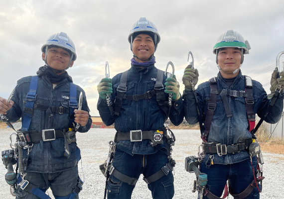 日本で技術を學び自國で生かしたいという海外の研修生?技能実習生を當社の社員として受け入れ、建設の技術を學んでいただいています。現在は合計15名が現場で活躍中。もちろん、研修中であっても職人と同様にフルハーネスや指差し呼稱を徹底するなど、安全への取り組みは大辰基準です。